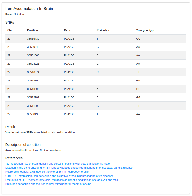 You can view the analysis details, identified SNPs, genetic interpretation, condition descriptions, and multiple scientific references for further exploration.